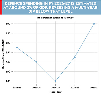 Defence spending in FY 2026–27 is estimated at around two per cent of GDP, reversing a multi-year dip below that level