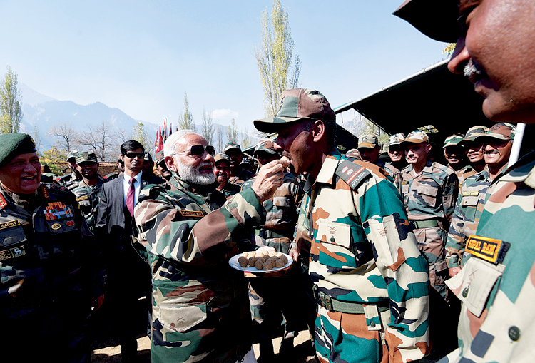 Prime Minister Narendra Modi celebrated Diwali with the jawans of Indian Army and BSF, in the Gurez Valley, near the Line of Control, in Jammu and Kashmir on October 19, 2017. The Chief of the Army Staff, General Bipin Rawat was also present at the occasion.