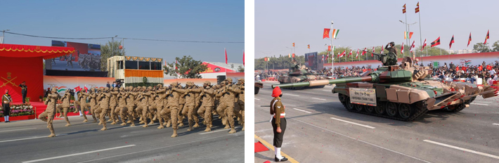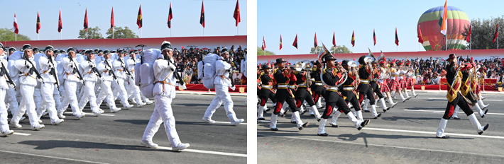 The parade featured over 30 entities participating in an impressive march-past with seven distinguished marching contingents, representing various Regimental Centers, including MADRAS Regimental Centre, RAJPUT Regimental Centre, Regiment of Artillery, Mixed Scouts Contingent and a NCC Girls Contingent. In a remarkable first, two special contingents participated in the parade, the Bhairav Battalion Contingents from RAJRIF and SIKH LI, symbolising the Indian Army's strategic shift towards modern, agile and lethal warfare capabilities, specifically designed for rapid, high-impact operations along its borders. These contingents reflected Bhairav Battalions as a "lean and mean" force representing lndia's resolve to "fight smarter and strike faster" in the modern battlefield. A fly-past by Army helicopters such as LCH, ALH, WSI and APACHE aircrafts further enhanced the grandeur of the parade.