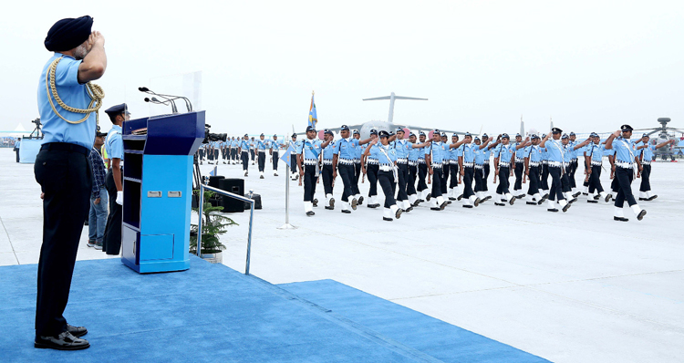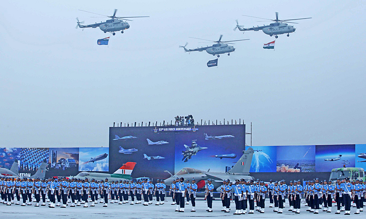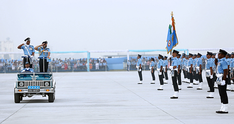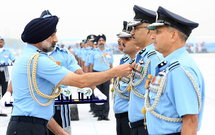 The proceedings commenced with the marching-in of the President's Colours, symbolising pride, unity, strength and esprit-de-corps. On arrival, the Chief of the Air Staff was presented with an aerial salute by three Mi-17 IV helicopters in 'Dhwaj' formation trooping the National flag, IAF flag and Op Sindoor flag. The ceremonial parade was commanded by Group Captain Chetan Pradeep Deshpande. While the Air Force Band's patriotic tunes set the tone for the march past, matched by the Air Warriors' precise and energetic footsteps, the Air Warrior Drill Team captivated the audience with their sharp and synchronised movements, leaving a lasting impression on all present. The CAS also felicitated Air Warriors with a total of 97 medals across categories and six Unit Citations.