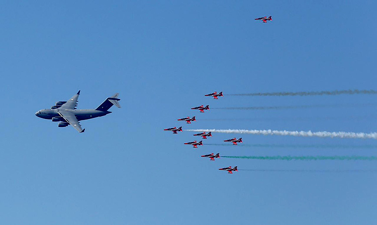 The flying display encapsulated this year's theme for the celebrations: "Infallible Impervious and Precise" — "अचूक, अभेद्य व सटीक"